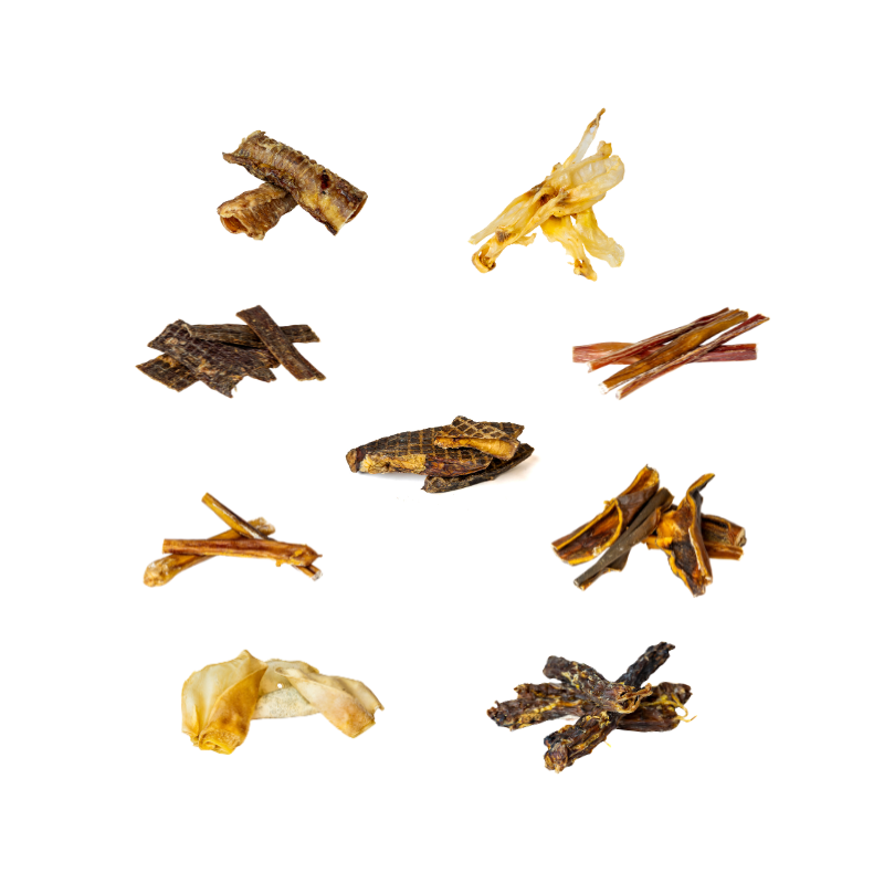 1X Orecchie bovine: fonte di Proteine, Ferro, Vitamine B (B12,B3, B6), Vitamina A, Vitamina E, Zinco e selenio, essenziali per la salute delle ossa, articolazioni e cartilagine;